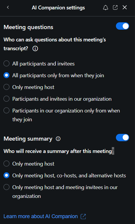 - Select an option from the drop-down menu to select who will receive the meeting summary.